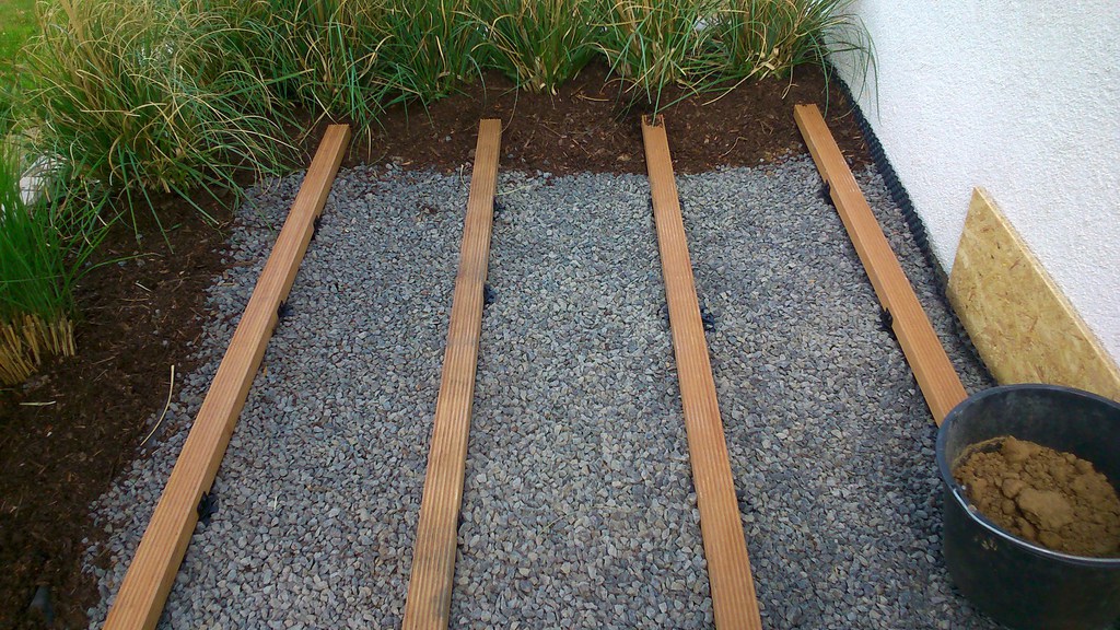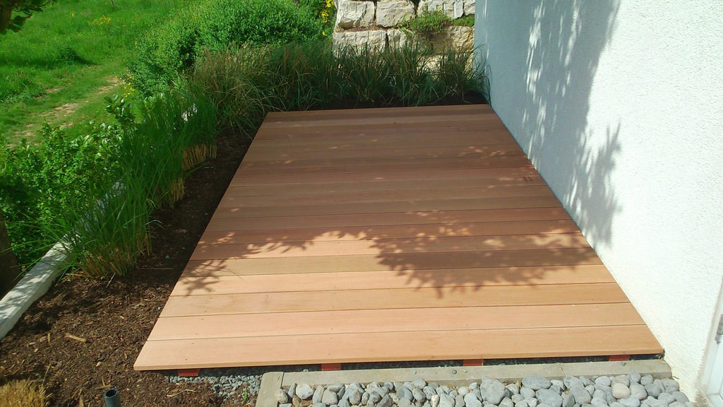 -Lieferung und Montage der Hartholz-Unterkonstruktion auf witterungsbeständigen Kunststofffüßen